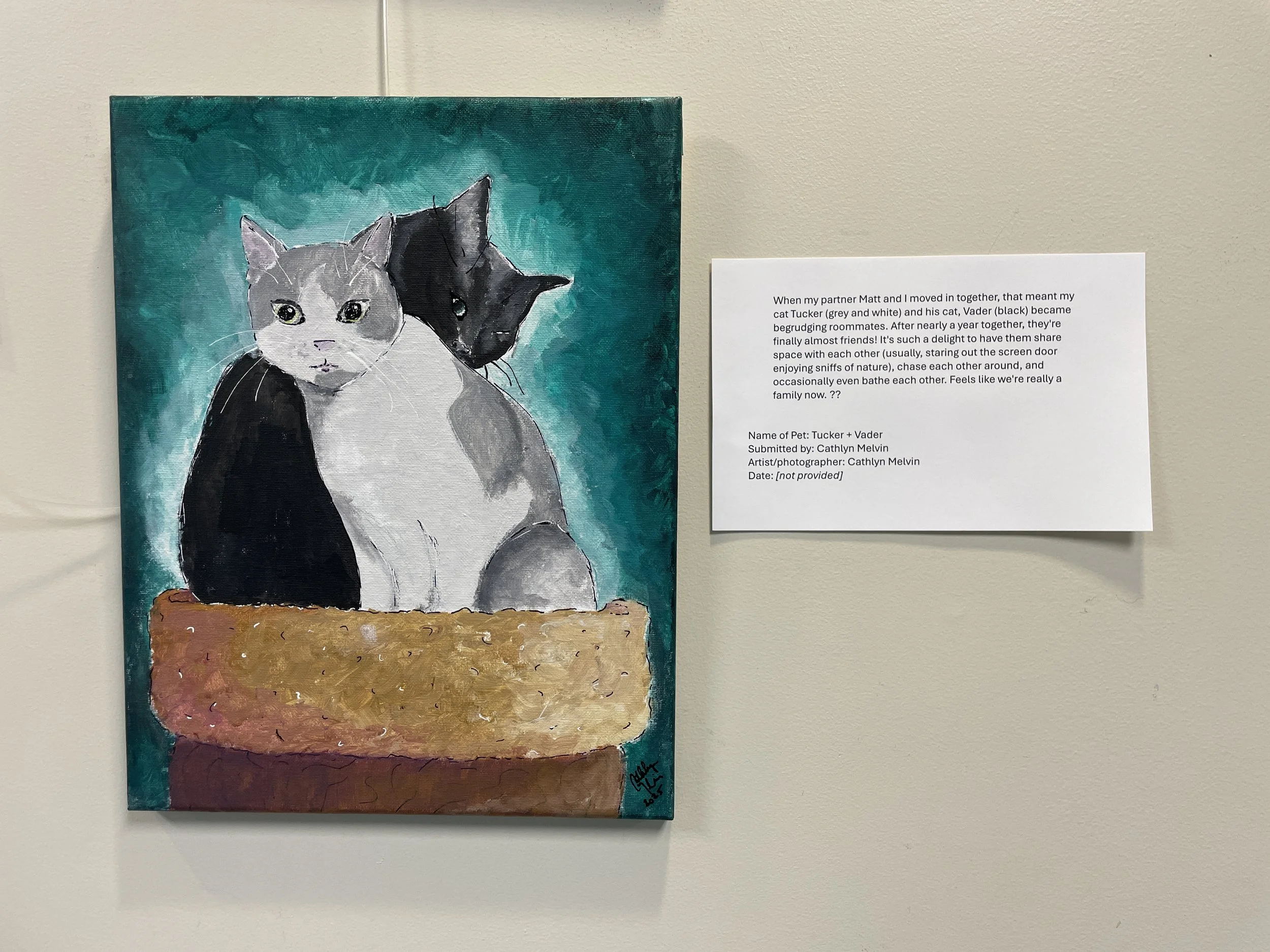 I started painting to fill a wall with images of my cat, Tucker. Now, I’ve painted lots of other beloved creatures — those who are still with us and those who have crossed the rainbow bridge.